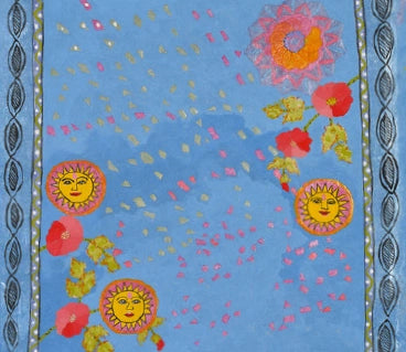 "In my studio I have many quotes to help keep me attentive, creative and emotionally human. One quote reads: What must be present are: Burning passion, unadulterated enthusiasm, perseverance, longing for a beautiful future. To me, these all touch important domains necessary for an artist and a human being. I consider myself a Symbolic Abstractionist, incorporating meaningful symbols into fields of abstraction and pattern. For over 25 years, I have been deeply immersed in the almost unearthly beauty of Indian miniatures. My work weaves meaning, symbol, color and purposeful design into my need to offer beauty in the everyday. Authenticity has always been of utmost importance, not only in my intentions but in the materials I use. Therefore, I work with 23 carat gold leaf, handmade papers, metallic candy wrappers, Indian wood blocks, decorative papers, collage and a variety of paints that give me a matte look and feel."